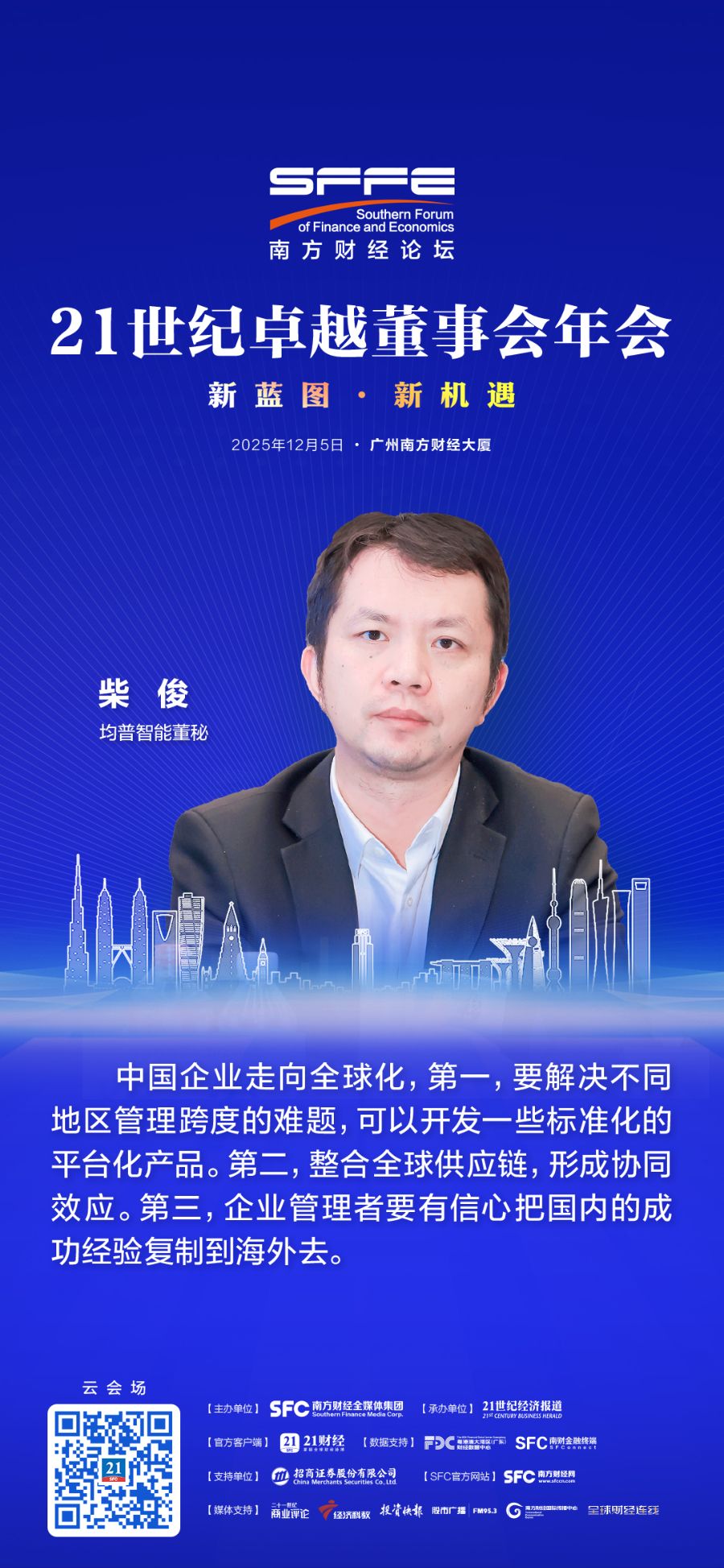 大会以“新蓝图,新机遇”为主题,在大会圆桌讨论环节,均普智能(688306.SH)董秘柴俊就中国企业出海的破局之道进行分享。
